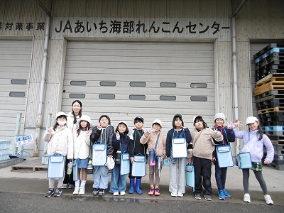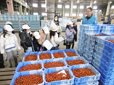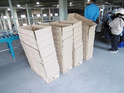 職員の方が、子どもたちに農家さんが収穫したれんこんが、その後、JAやスーパーで商品として、売られるまでの工程を説明してくださいました。普段は見ることができない2階にも案内していただきました。れんこんの他に、ミニトマトも出荷できるようになっていました。