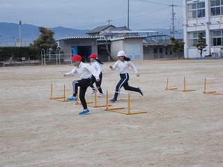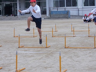 4年松組の体育の授業の様子です。「ハードル走」をしました。5つのハードルをできるだけ同じ足で踏み切ることや、高く跳ばないこと、ハードルとハードルの間の歩数をできるだけ少なくすること、などに気をつけて行いました。