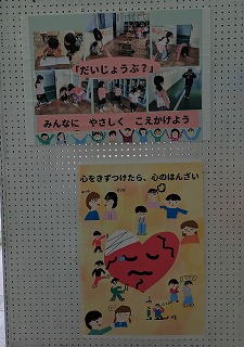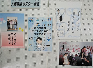 12月11日の発表会でお披露目した各学級で作成したポスターが児童玄関横の掲示板に貼ってあります。どの作品も力作ばかりです。思いも伝わってきますね。
