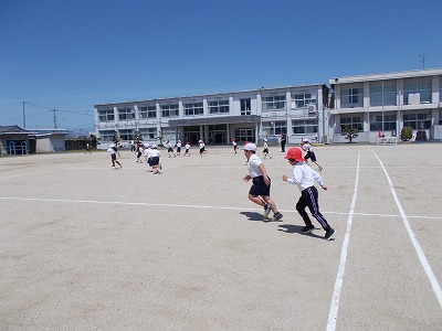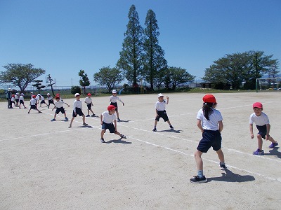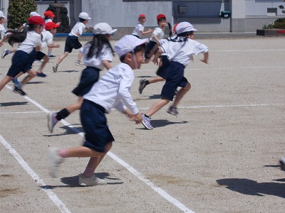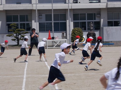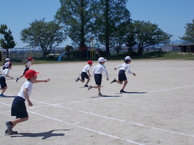スタートの体勢をいろいろと変えながらゲームをしました。暑い中でしたが、子どもたちは、元気よく鬼遊びゲームを楽しんでいました。