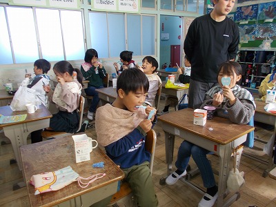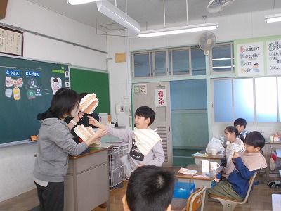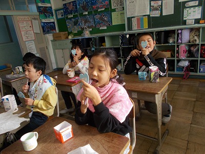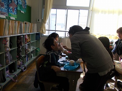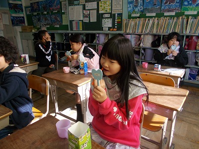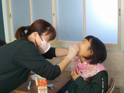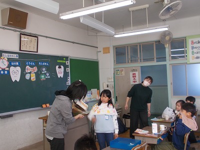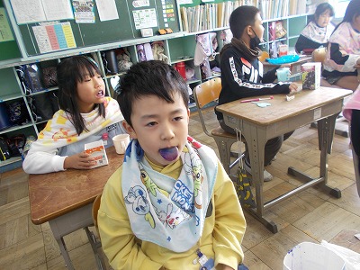 まずは、むし歯になるしくみ「むし歯のたし算」についてのお話を聞きました。むし歯にならないようにするためには、磨き残しがないように歯磨きをする必要があります。自分の歯磨きで、どの部分に磨き残しがあるのかを確かめるために、染出しを行いました。いつものピンク色の薬剤ではなく、今回は紫の薬剤を使用しました。子どもたちは、それだけで、「うぁ~、気持ち悪い」「どんな味あするの?」「こわ~い」と、大騒ぎでした。染出しの薬剤を歯科衛生士さんや、保健室の先生に塗ってもらいました。2回、口をゆすいで、歯についた薬剤の色が赤色は新しい歯垢、紫色は古い歯垢だそうです。