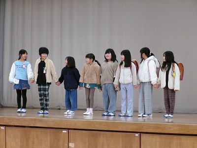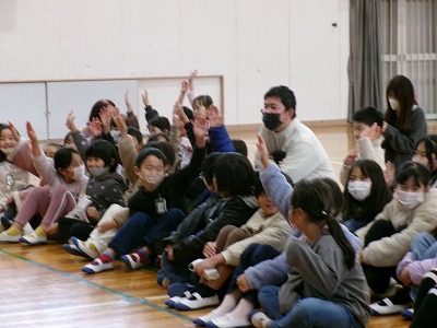 体育館には、1年生から6年生までの子たちが見に来ていました。劇の内容は、小学生が学校から帰るところに不審者が現れ、「車に乗っていかないか?」などと、誘ってくるというものでした。不審者役の児童や子ども役の児童の迫真の演技は、見事でした。劇の途中に「不審者にもし、会ったらどうしたらよいか」という、3択クイズもありました。実際に防犯ブザーを鳴らす場面もあり、見ている子どもたちは、「防犯ブザーって、意外に音が大きいね…」と話していました。最後には、ミュージカルのようにカーテンコールまでありました。