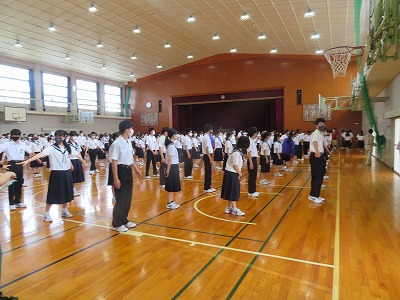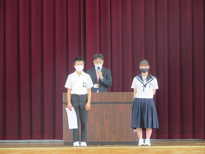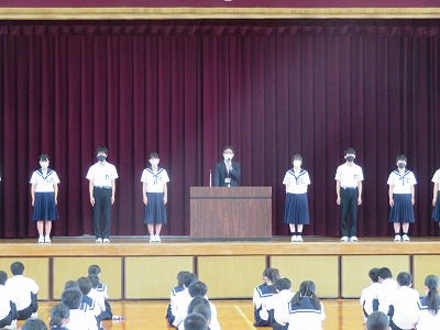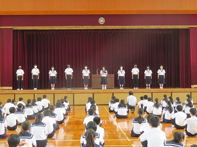 0628生徒朝礼.pdf 後半には、いよいよ今週末から開催される「海部地区中学校総合体育大会」の壮行会を実施しました。各部の部長が代表として壇上に整列し、「これまでの状況を嘆くのではなく、最後の大会を迎えられることに感謝の気持ちもって精一杯がんばります」という部長代表の力強い言葉を聞くことができました。全ての部に、全校から拍手で応援の気持ちが伝えられました。