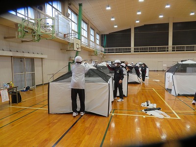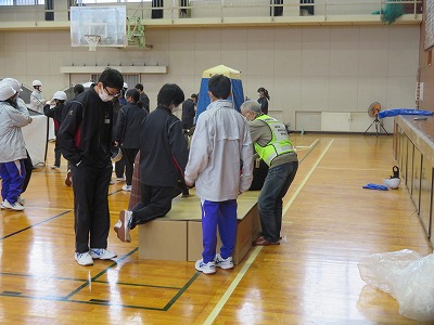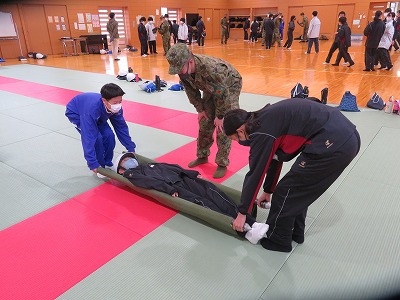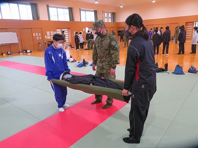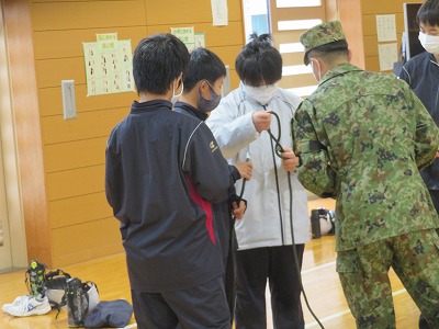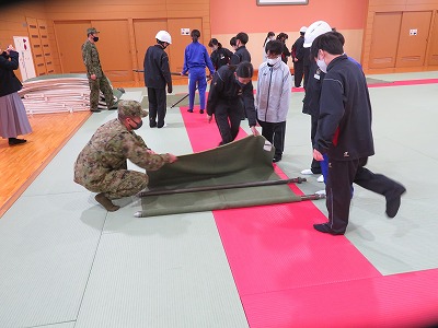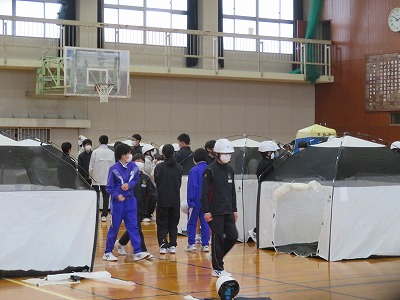 感染症対策に対応して、2年前とは違い、体育館での避難所設営には「簡易テント」を使用するようになっていたり、今回からは自衛隊の方にもお越しいただき、災害に関する「オリエンテーション」や、災害発生時に役立つ救急搬送体験、ロープワーク体験等も学習したりして、より生きた知識・技能を学ぶ貴重な機会となりました。