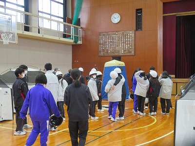 2年前までは、愛西市の「減災の会」に協力をしていただき、「避難所設営体験」として段ボールでの間仕切りを体育館に広げての避難所設営、飲料水の確保、非常食の試食等を行っていました。しかし、コロナ禍の中、昨年度は開催を中止したため、今年度に2学年で実施をして、どの子にも災害発生時に「地域の力」になれるように、こういった学習を実施しました。
