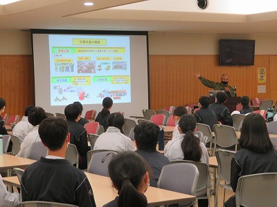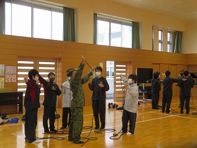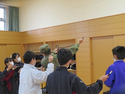 月曜・火曜の2日間、学校に「自衛隊」の方と愛西市「減災の会」の方にお越しいただき、1・2年生を対象に「防災教室」を実施しました。