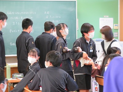 この授業は、本校でも長年継続して2年生で実施していますが、直近のここ2年はオンラインで母親と赤ちゃんにつないで、モニター越しにお話を聴かせてもらっていました。そして今年度、3年ぶりに赤ちゃんとお母さんに実際に学校まで来ていただき、対面でお話を聴くことができ、生徒だけでなく赤ちゃんの笑顔も教室にあふれ、普段の授業では味わうことがないくらい温かい雰囲気の1時間になりました。