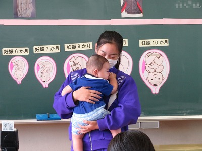 いよいよドキドキの「抱っこ体験」。赤ちゃん人形でしっかり練習してから、クラスで3名の希望者限定で、実際に赤ちゃんを抱っこさせてもらいました。