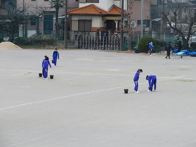 1月に入ってから寒い日が続いていますが、特に先週の学校再開の頃から強い寒波が日本列島を覆っていると天気予報などで聞きます。今日も、この辺りで降雪が予想されていた予報に違わず、本当に寒い日になりましたが、そんな寒空の中、運動場で懸命に作業をする子たちがいました。