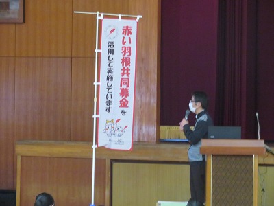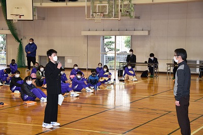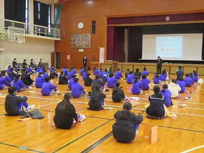 例年は、いくつかのグループに分かれて、いろいろな体験学習を行うのですが、今年度は感染症対策が必要ということで「道具の共用」や「互いが触れ合う」活動を控え、みんなで「認知症サポート」について、市の社会福祉協議会の方にご協力いただき学習しました。