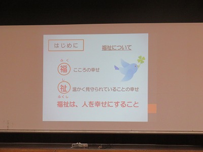 最初は、「福祉」について概要を聞きました。「福祉は、人を幸せにすること」「