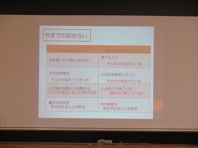 続いて「認知症について知ろう」ということで、認知症に関する基礎的な内容を学びました。「もの忘れ」と「認知症」の違いについて考えることができました。