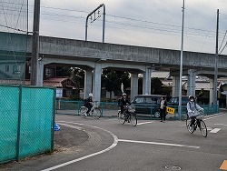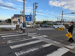 学校周辺と小津橋に別れ、生徒が登校する姿を見守っていただきました。同時に、