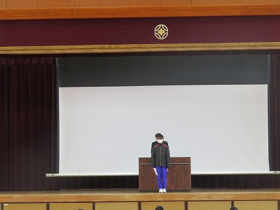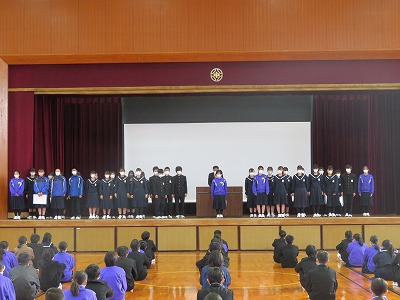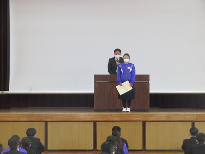 最初の「伝達表彰」では、市給食コンクールと生徒指導標語コンクール、さらに吹奏楽部が参加した海部・西尾張地区のアンサンブルコンクールの結果が披露されました。