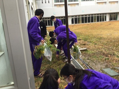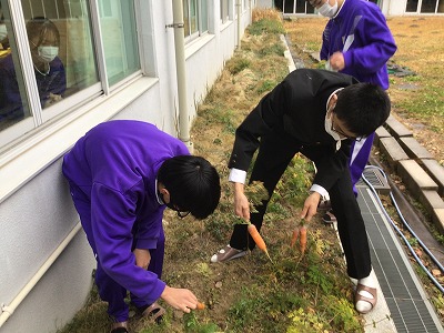 9月から栽培を始めた人参でしたが、それから4か月間、登校した2年生の子たちが校舎裏に水遣りに行く姿がありました。その努力の甲斐あって、めでたく「収穫」となったのですが、獲れた人参は大小さまざまな大きさがあり、育てた2年生の個性豊かな様子が表れているようでした。ちなみに収穫後の人参は、育てた2年生の希望者に配付して締めくくりとなりました。2年生の皆さん、お疲れさまでした!