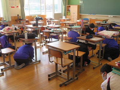 清掃が終わって、ようやく昼放課というところで、校内に突然「訓練、訓練!」というアナウンスの声と緊急地震速報(デモ版)が流れ始め、みんなが避難行動に移りました。