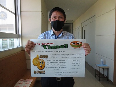 昨日から前期末テストが始まりましたが、昨日の朝には学校の廊下に、こんな英語で書かれたメッセージが貼られていました。