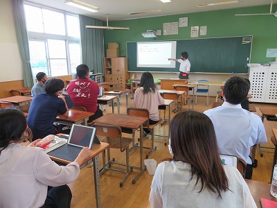 片方の教室では「G-suite」の活用方法について、もう一方の教室では「ロイロノート」の活用方法について、ワークショップを行いました。今回は、自分たちでお互いに教え合って情報共有する研修となりましたが、今後は講師の先生等もお招きして、さらに活用方法を高めていく予定です。