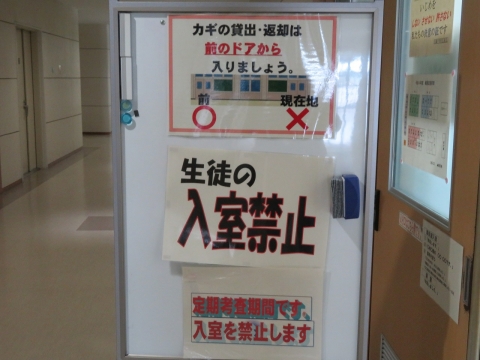 昨日から、生徒の職員室への入室制限をお知らせする「表示」が、職員室前の廊下に出してあります。
