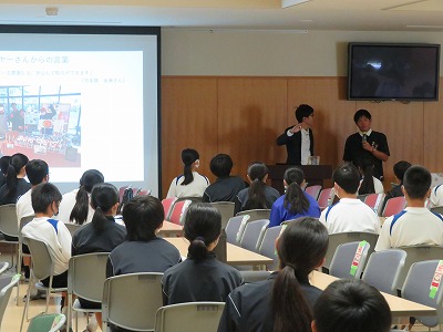 昨日の午後には、愛西市で蓮根を栽培している「株式会社 田島蓮園」からお二人にお越しいただき、11月に「職場体験学習」を控えている2年生が、事前学習を行いました。