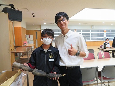 お話の途中には「クイズ大会」と称して生徒が質問に答える場面もあり、正解した生徒は「朝に収穫した蓮根」をご褒美にいただきました!!羨ましいー!!