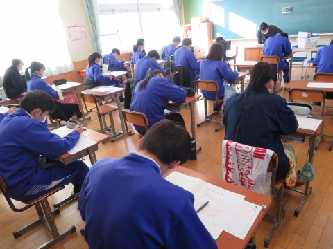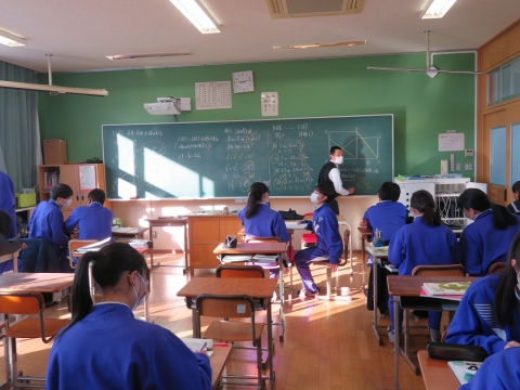 今日は、いよいよ来週の月曜に私立高校・専修学校の特色・推薦入試を控えている「3年生」の1時間目の様子を紹介します。 A組は、1時間目から元気に、体育「サッカー」で試合に取り組んでいました。先生からは、ゴール付近でのプレーについてアドバイスがあり、それぞれ意識をもって取り組む中でも、点が入れば歓声が上がり、互いにハイタッチをし合うなど、アツく盛り上がってました。 B組は、国語の先生がお休みとなったため、本来理科を担当している先生がピンチヒッターで教室にいました。しかし、内容は国語の「テスト演習」に取り組んでいて、入試前だけあってピンと張りつめた空気の中で時間が過ぎていました。 C組は「数学」。黒板には直角三角形の性質に関する板書がありましたが、教室にお邪魔したときには子どもたちが互いに教え合ったり、聞き合ったりする「プチ自習」の時間になっていました。こういう時間には、それぞれの子の勉強に向かう「心の状態」も違いを感じることができます。 明日は、中学校にもすっかり馴れて、そろそろ先輩になる準備を始めつつある「1年生」の様子を紹介します。