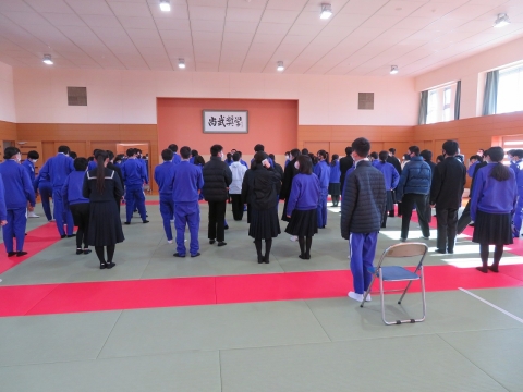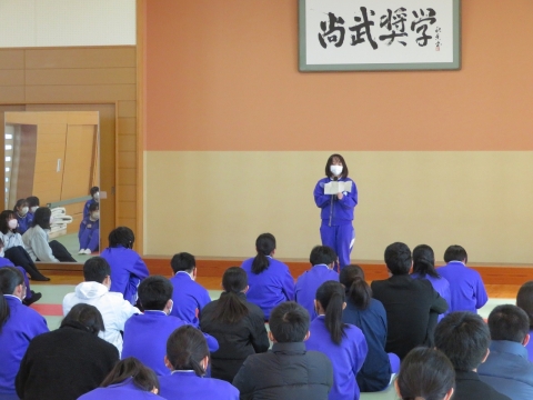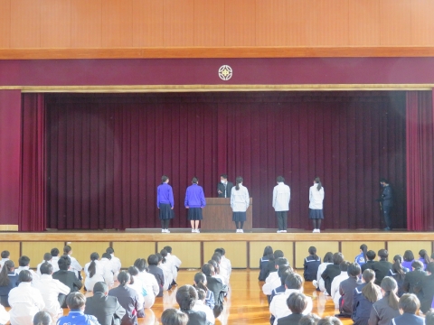 冬休み前、そして2022年最後の授業日となった今日、まずは全校が体育館に集合をして「全校朝礼」を行いました。風が強い中でも、生徒会執行部の子たちは全校の仲間を笑顔で出迎えてくれました。