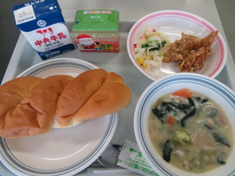 2022年を締めくくる給食は、クリスマスを意識して「唐揚げ」「ケーキ」がありました!