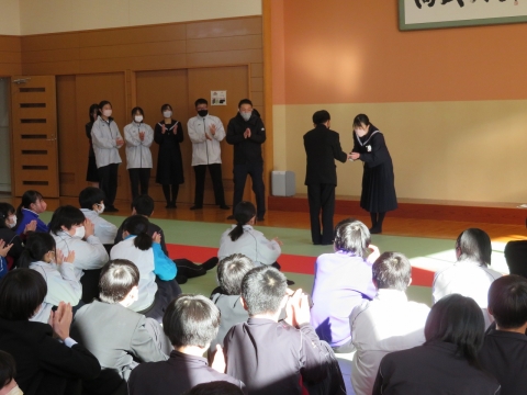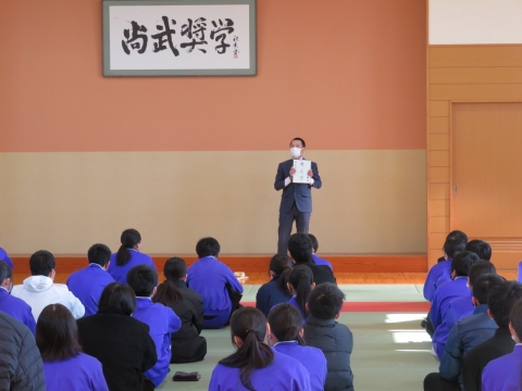 最後の授業日でしたが、今日から校舎内での防寒着の着用ができるようにしました。まだまだ感染症対策による換気を常時行っていることから、エアコンの効きが十分ではないため、少し温かくなるまでは健康管理を第1に進めていこうと思います。