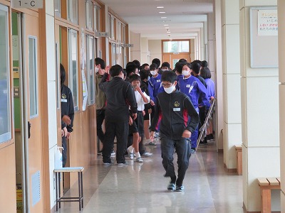 先週金曜の6時間目には、今年度2回目の「避難訓練」を行いました。今回は「爆破予告・不審者侵入等への対応」について確認しました。