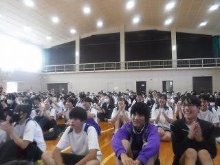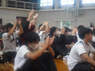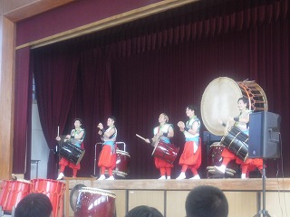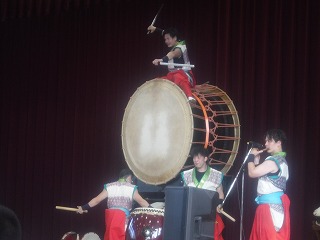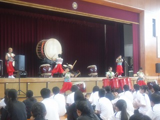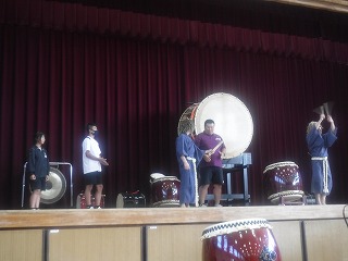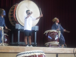 実際に太鼓を叩かせてもらう体験の時間もあり、ステージに立った代表の生徒・先生は戸惑いながらも太鼓に触れあいました。