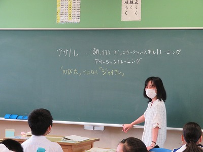 この「アサトレ」は、「アサーショントレーニング」という意味と、月曜1時間目という週初めの「朝に行う」ということを掛け合わせた本校独自で生み出した言葉で、4年前から継続して行ってる取組です。