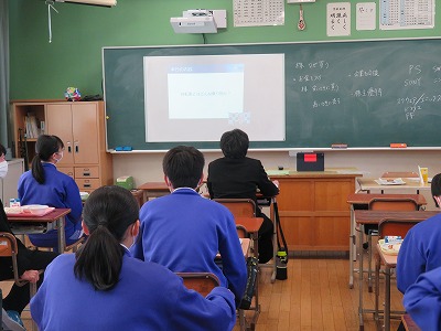 この講習会は市内複数校で同時配信されているため、時間や場所の設定が限定されてしまい、どうしても「食べながらの視聴」ということで集中して視聴することができにくい状況になっていますが、それでも生徒は「へー」とか、「(出題されたクイズに対して)Aだな」などつぶやきながら理解を深めている様子が伝わってきます。