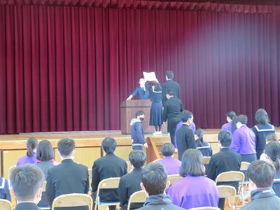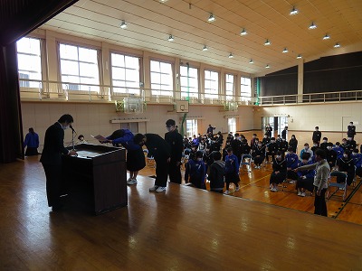昨日の1時間目には、いよいよ「卒業式練習」が始まりました。まずは、「まん延防止等重点措置」が県下に発令されている中での卒業式、しかも大切な公立高校受検直前ということで、準備を進めてきた卒業生による「合唱発表」も市内統一で中止となることを生徒に伝えました。本当は発表したい気持ちの子も多くいたと思いますが、「仲間の安全と受検を守るため」という部分にどの子も納得をしてくれたようで、改めて3年生みんなの優しさを感じることができました。