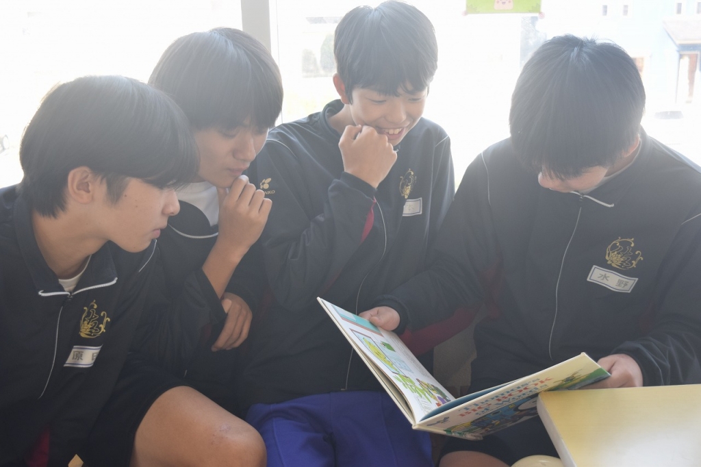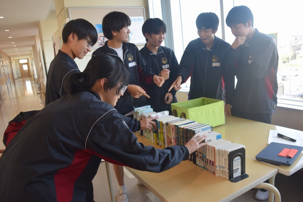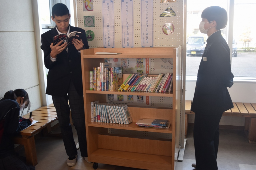 本校の図書室は教室棟3F東側にありますが、なかなか足を運ぶ機会が少ない生徒の皆さんも、廊下に本棚があるなら手に取ってみたくなるのではないでしょうか。今日は早速、本棚を覗きにきてくれる生徒の姿がありました。図書委員の生徒もがんばっておすすめの本のPRをしています!