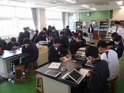 本校では、授業力向上のために一年に数回互いの授業を見合い、指導法を研究しています。テーマを「自ら学習を調整し、自ら学びを決定して、主体的に学び続ける生徒の育成」として、生徒が生き生きと自ら学びを進める授業づくりを目指しています。