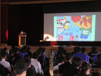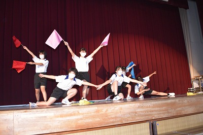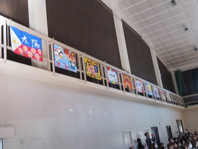その後は、夏休みに各クラスの代表がそれぞれに思いを込めて作った学級旗を披露し合う「フラッグアピールショー」が行われました。旗にも紹介のスピーチにも各クラスの個性が存分に表れていて、体育館の雰囲気が一気に和やかになりました。