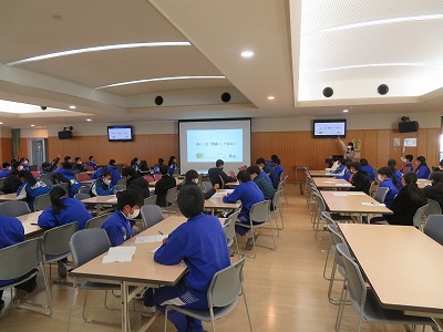 授業の中では、「違いは間違いではない」「『みかんていいね』を心がける」「『聴く』ことを大切に」というキーワードに絡めて、いろいろな角度から周りの人とのより良い関係作りにつながるかかわり方へのヒントを話してもらうことができました。また、最後には何人かの生徒がカウンセラーに質問するなど、興味・関心をもって取り組んだことが伝わりました。