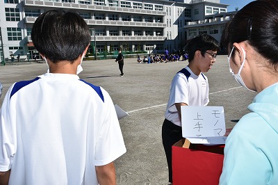 最初の種目は、生徒会で話し合って決めた「生徒会種目『借り人競争』」でした。3学年の同じクラスでチームになった(A組チーム・B組チーム・C組チーム)先輩・後輩で協力し合って、くじに書かれた内容に当てはまる仲間を連れてくる競技に、応援席のあちこちから笑いや歓声が上がっていました。