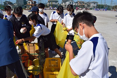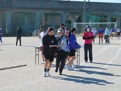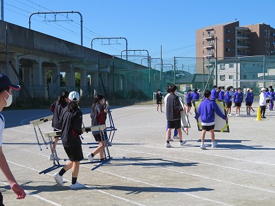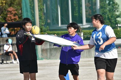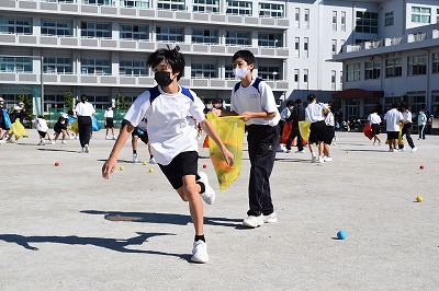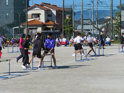 引き続いての生徒会種目は「障害物競争」でした。チームの先輩・後輩で協力し合ってボールを落とさないようにしながら、障害物(ハードル)を乗り越えてゴールを目指しました。さらに競技だけでなく、各委員会で分担した役割に、精一杯取り組む子どもたちの様子も光り、自分たちの学校祭をやり切りました!