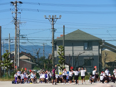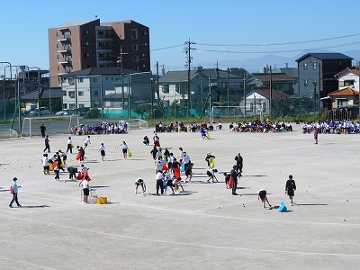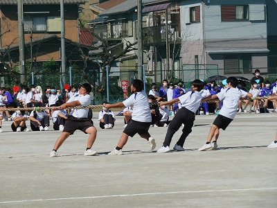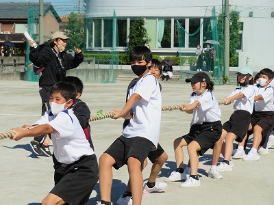 その後は、各学年で計画・準備をしてきた「学年種目」。 最初は1年生の競技「玉集め」と「綱引き」でした。どの子も精一杯取り組み、先生や先輩から温かい声援を受けていました。