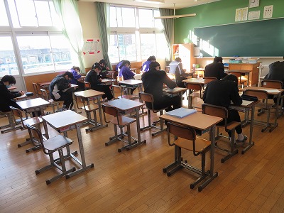 この空席は、私立高校・専修学校の推薦入試に臨んでいる子たちの席になります。少し寂しい教室で授業をしている仲間も、教室にいない仲間の頑張りを応援しつつ1日を過ごしています。感染症拡大が心配な状況下での入学試験ですが、今のところ体調を崩して欠席する子はいないようで、まずは一安心。