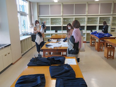 入学説明会が始まる前には、PTA保健体育委員会の方が中心になって、「PTA制服バンク販売」が行われました。来年度からは、ジャージのデザインが新しくなり、また制服の着用も毎日ではなく、普段は体操服やジャージでの登校が可能になるため、「購入する人はいないかもしれないなー」と思っていましたが、替えの制服などを購入していただける方が多くみえたようで、準備をしたPTAの方々も嬉しそうでした。また、3月の「学年PTA」の日にも在校生向けに販売をする予定です。在校生でも購入を考えている方は、ぜひご利用ください。