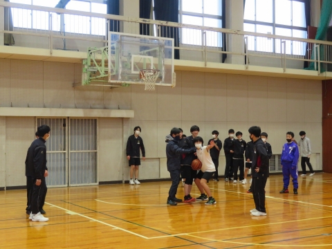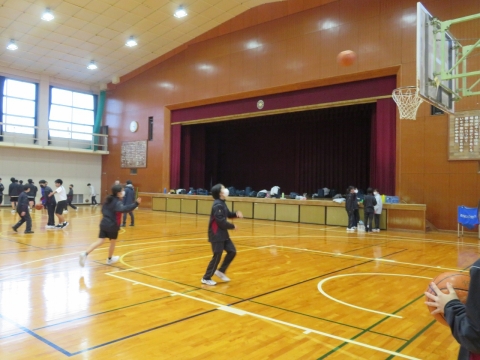 男子は、ハーフコートを使って「5対5」をしていました。各自が希望するポジションに分かれることで、どの子も主体的に練習に取り組む雰囲気がありました。今の課題は「ポストプレー」「スクリーンプレー」の上達ということで、時折顧問の先生がプレーを止めて解説をしながら、実際のプレーと理解の「レベルアップ」を図っていました。