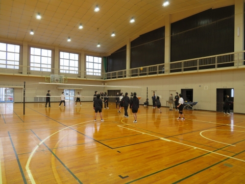 「バレー部」は、最初は男女別でウォーミングアップや基礎的な練習をしてから、合同で対戦形式の練習をしていました。