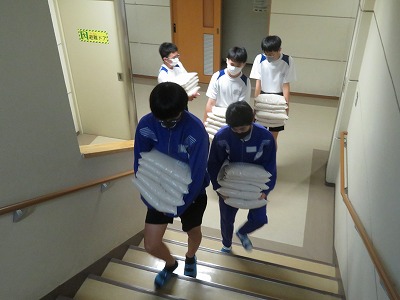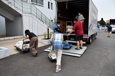 配付に先立って、先週の水曜日には本校に生徒数分のお米だけでなく、中学校区にある小学校・幼稚園・保育園が搬入され、それぞれの学校・園の関係者、さらには「子ども食堂」のボランティアの皆さんお越しいただき、搬入・分配作業を行いました。