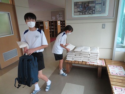 14日(火)の帰り、子どもたちは1人3kgのお米を一袋ずつ持ち帰りました。このお米は、農林水産省の「国産農林水産物等販路多様化緊急対策事業」を活用し、「町方ふれあい子ども食堂」を介して、NPO法人フードバンクあいち様より愛西市内小中学校在籍の子どもたちにいただくことができました。