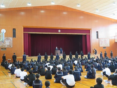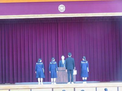 認証式に先立って、伝達表彰がありました。今回は「少年の主張 愛知県大会」「読書感想文コンクール」「理科作品展」「市民ソフトテニス大会 一般の部」で優秀な成績を収めた生徒の表彰を披露しました。