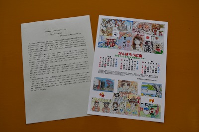 先週の水曜から修学旅行に出かけた3年生は、訪問先でお世話になった施設の方たちに、学年リーダーが中心になって作成した「絵手紙カレンダー」をお渡ししてきました。