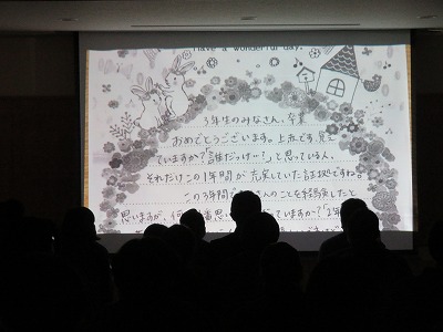 「3年生を送る会」の最後は、今まで授業や担任でお世話になった「転勤された先生からのメッセージ」を視聴しました。二人の先生からの手紙や動画から、今と比べると幼かった自分を振り返ることができる心温まる時間になりました。